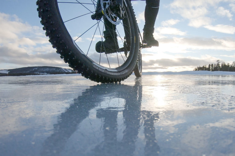 It was one of those days, David and I took our mountainbikes to Lake Skabrram, to do some cycling on the ice. The dog Skájdde followed along as always. The ice was really slippery and smooth. This was a real tough test for the Schwalbe Ice Spiker Pro Performance. Check out the video clips to see how they did perform.